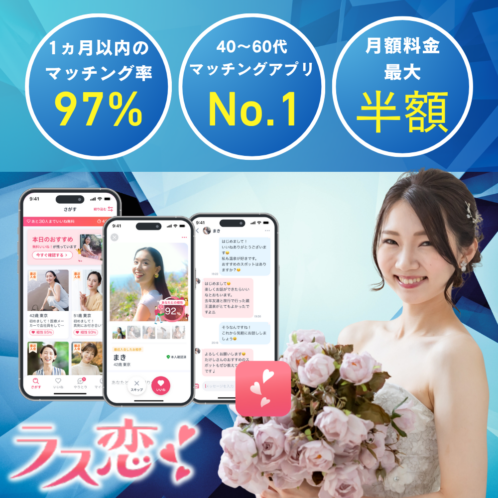 50代・60代での婚活を考えたとき、「もう遅いのでは?」と不安になる方も多いかもしれません。しかし、年齢を重ねたからこそわかること、求めるものがあります。そうした大人の男女が“本気の再婚”を目指す場所として、注目されているのがマッチングアプリ「ラス恋」です。